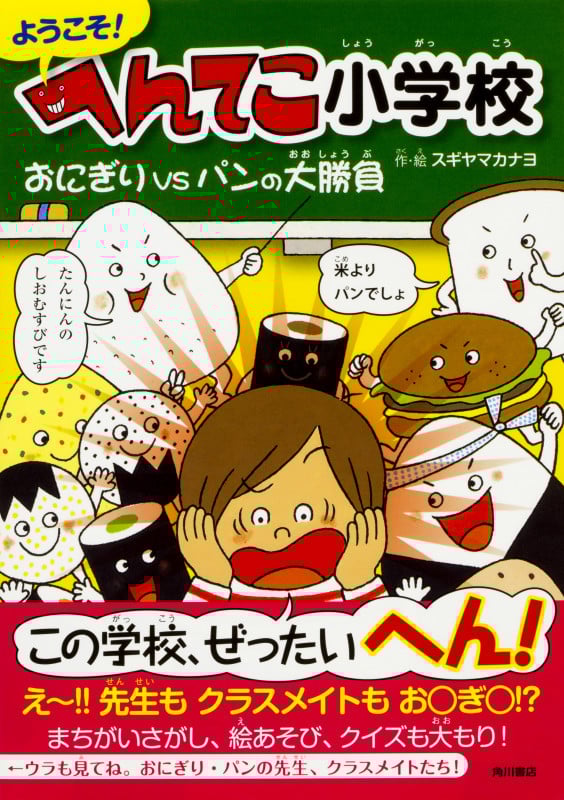 主人公のぼくの名前は、大谷とき。あだなは、チョキです。ぼくが転校した学校は、先生もクラスメイトも、みんながおにぎりの小学校だった! お母さんは、「先生は、色白でふっくらしていて、あたたかそうな先生だったわ」と言っていたけど、先生は、塩むすび先生! 校長は、おいなり校長! おにぎり小学校での給食や、国語、算数、社会などの授業では、遊びの要素を交えて、クイズや間違い探しで楽しく学べる。後半では、ランチ小学校と運動会での対決! ランチ小学校は、みんなパンだった!? つなひき、玉入れ、騎馬戦。最後は、全員参加のリレーの大勝負! 勝つのは、どっちだ? 絵遊びや、クイズ、間違いさがしなど、遊びページもたくさん! おにぎりも、パンの子どもたちも、種類がいっぱいのキャラクター! 笑って読める物語!