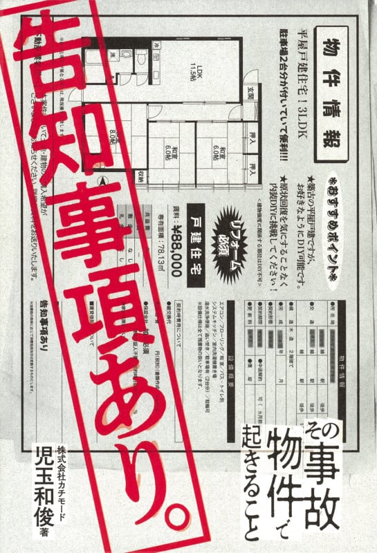 【注意】※これは、フィクションではありません。 存在しないはずの302号室の鍵、浴室の点検口から出入りする謎の男、突然喋り出す遺品の人形、毎夜ガラス越しに現れる黒い影、前触れもなく失踪した不動産の営業マン、火災を逃れ残った不思議な絵、深夜に背後から覗き込む気配――――部屋を探すときは、「告知事項」にご注意ください。 事故物件で起きた出来事をはじめ、著者自身が実際に体験した不思議なエピソードを書籍化。本当に怖いのは、事故物件なのか? それとも…… 不動産管理会社の営業マンとして約7,000室の物件を内見し、日本で初めて“オバケ調査”を行う株式会社カチモードを起業した著者による実録集。 事故物件【じこ-ぶっけん】売買や賃貸の対象となる不動産物件のうち、その建物の部屋または共用部分などで、主に自殺や殺人などの死亡事故が発生した経歴のあるもの。心理的瑕疵[かし]のある物件。