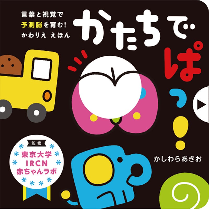 絵本の右にある透明のフィルムを引くと、絵がぱっ!と変化する不思議な赤ちゃんのためのしかけ絵本。『かたちでぱっ!』は、りんごがちょうちょうになったり、コップがぞうになったりと変化が楽しめます。また、透明フィルムをつまんで引っ張る指先の運動にもつながります。東京大学IRCN赤ちゃんラボの辻研究者の解説付きです。
